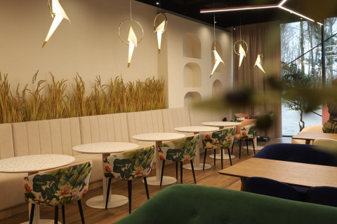 Интерьер выполнен в светлых, воздушных тонах. Под потолком парят большие аэростаты — символ «Луки Парка» и напоминание о том, что Великие Луки по праву считаются столицей воздухоплавания. В вечернее время они мягко подсвечиваются, создавая тёплую и праздничную атмосферу.